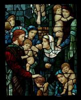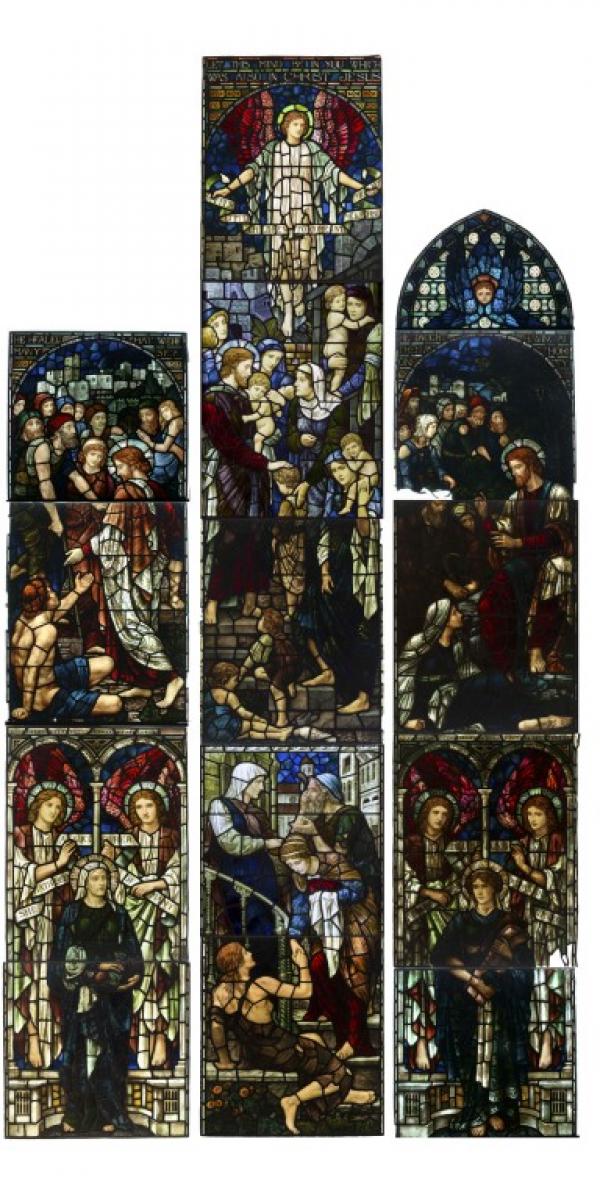 Brief description: Jesus healing the sick, with women and nude children. A panel from the centre light of a three-light stained glass window depicting scenes from the Ministry of Christ by Henry Holiday, 1907.