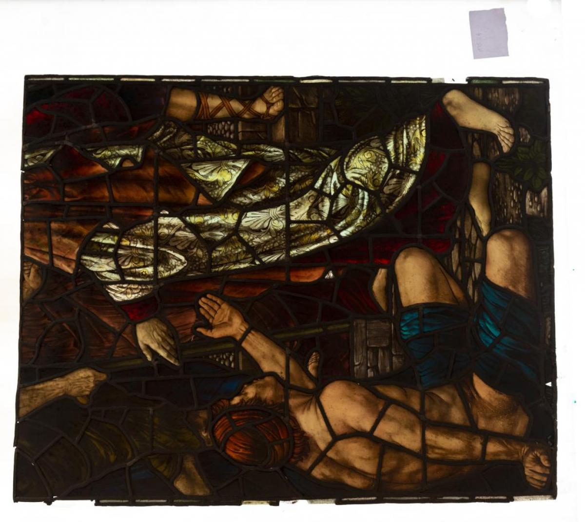 Brief description: Stained glass panel showing a seated man with his arm outstretched. Made by Henry Holiday, 1907.