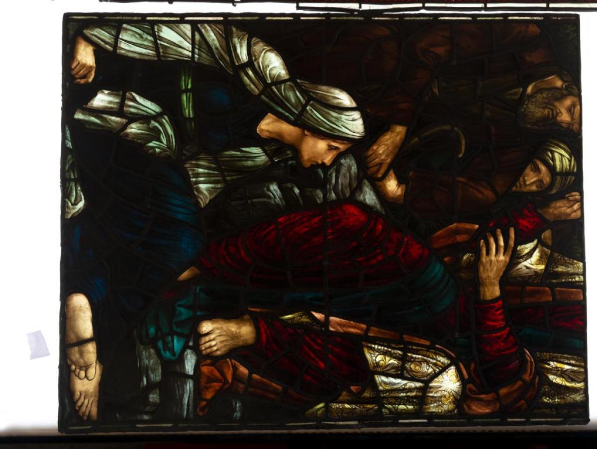 Brief description: Stained glass panel from right light showing body of Jesus, with woman sitting at his feet. Made by Henry Holiday, 1907