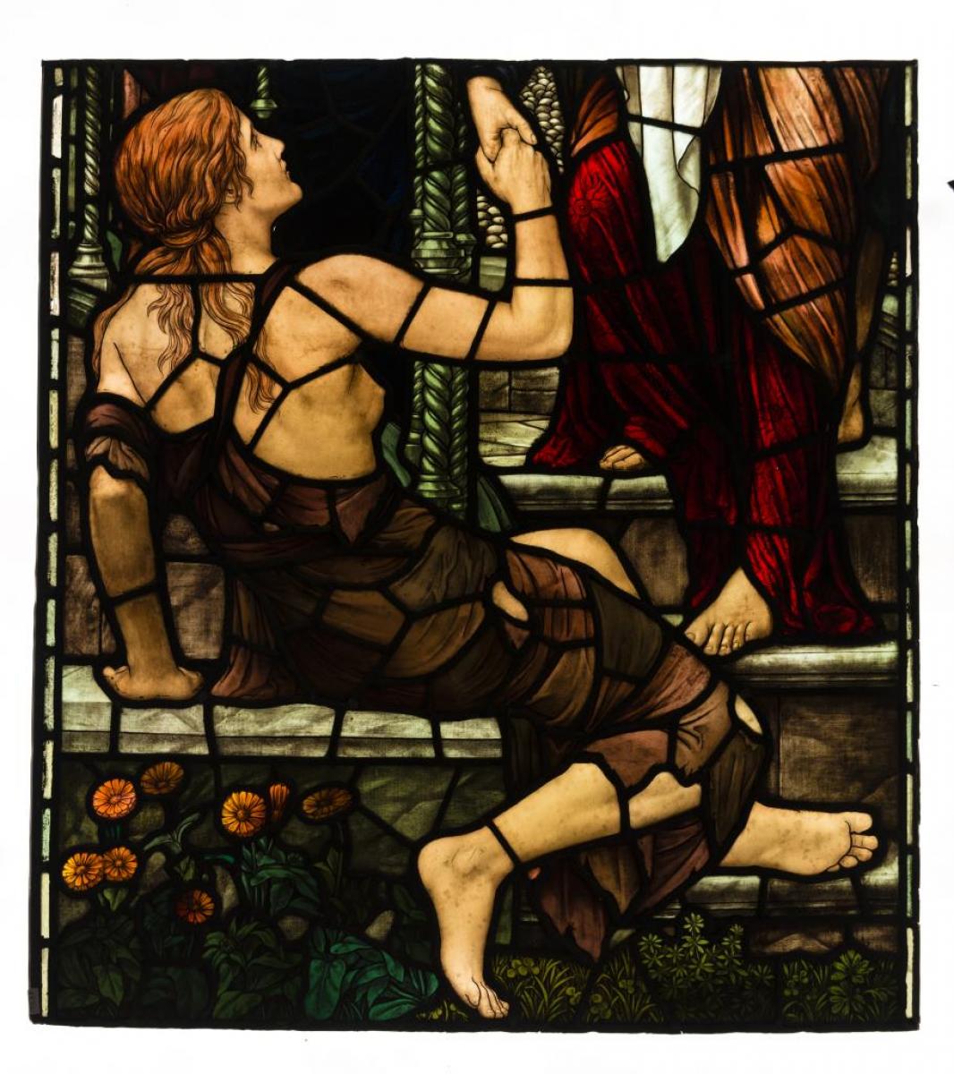 Brief description: Stained glass panel from centre light showing a woman with ripped clothing holding another figure's hand. Made by Henry Holiday, 1907