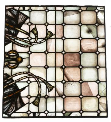 Brief description: Stained glass from the centre of a light. Composed of white rectangular quarries of slab glass. The bottom of the angels robes can be seen. Made by John Hayward, 1958