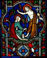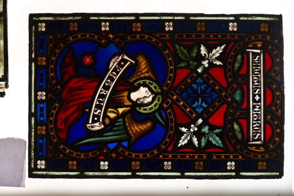 Brief description: Surviving stained glass base panel of a lancet window. Emblem of St Peter. Angel bearing inscribed scroll with above inscription. Designed by John Hardman Powell, made by John Hardman and Co, 1852.