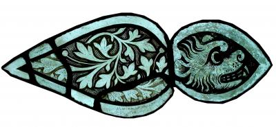 Brief description: Stained glass tracery light, grotesque. Demon face in profile, with a staring eye, prominent teeth and mane. Foliage pattern in tear-drop shape. Medieval English artist circa 1340