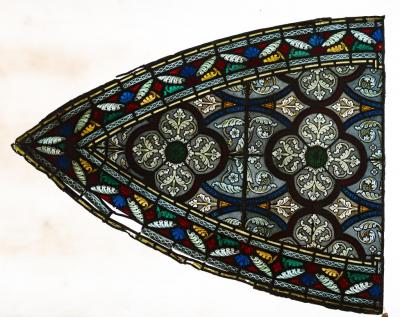 Brief description: Grisaille apex panel to window depicting the parable of the lost silver. Made in 1865 by James Tennant Lyon. Part of a lancet window.