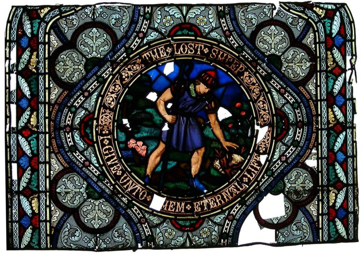 Brief description: Stained glass roundel depicting the parable of the lost sheep, set amongst grisaille. Made in 1865 by James Tennant Lyon. Part of a lancet window.