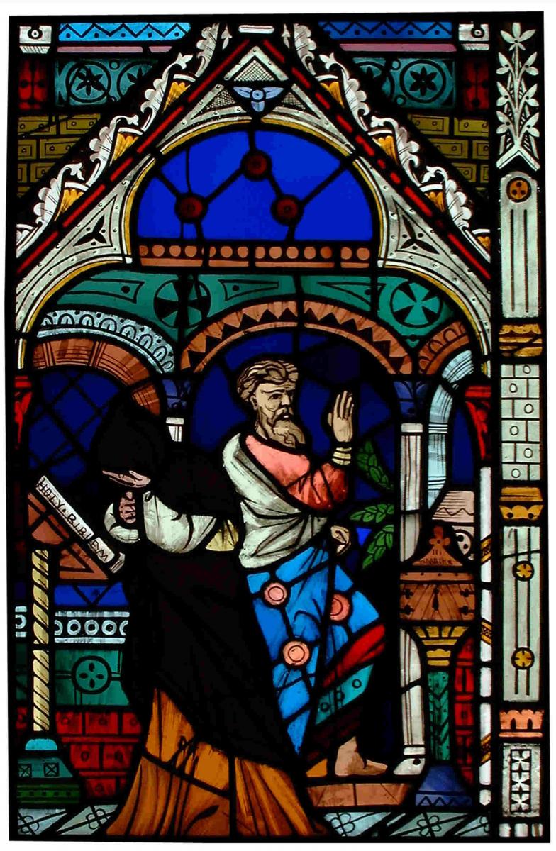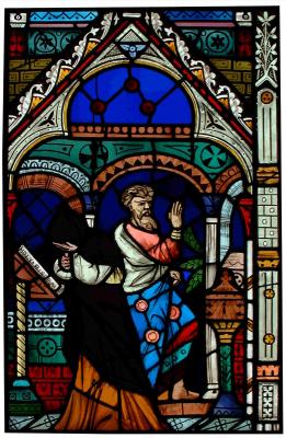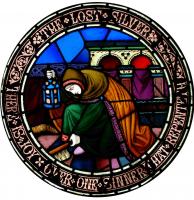 Brief description: Panel of the parable of the Pharisee and the Publican. Early example of work by Scottish designer Daniel Cottier. Made by Field and Allan, 1865.