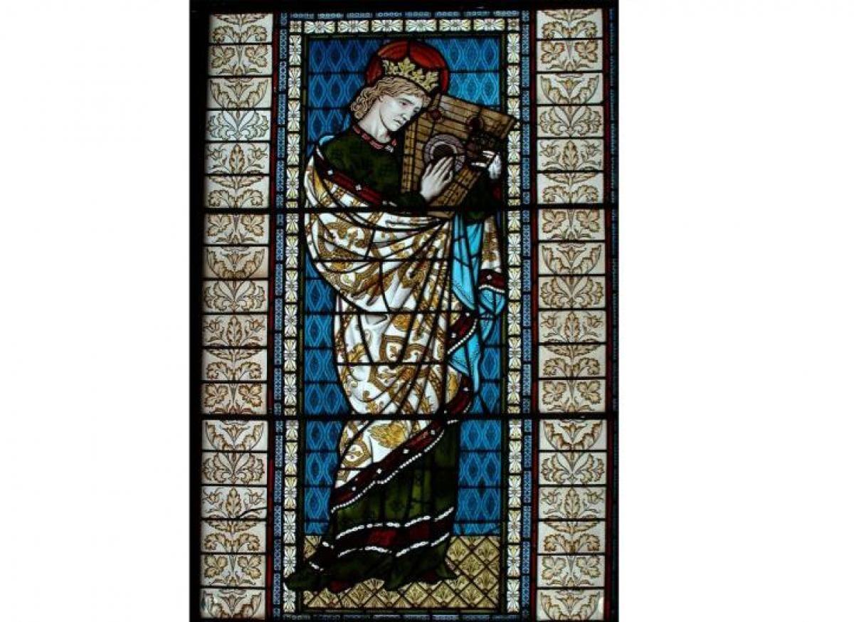 Brief description: Single stained glass light depicting King David designed and made by William de Morgan circa 1870. King David playing stringed instrument.