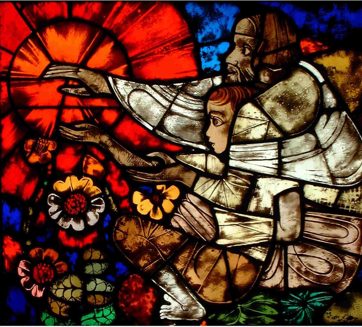 Brief description: Rectangular stained glass panel depicting an old man and a boy reaching towards the sun. Made by Ervin Bossanyi in 1932.