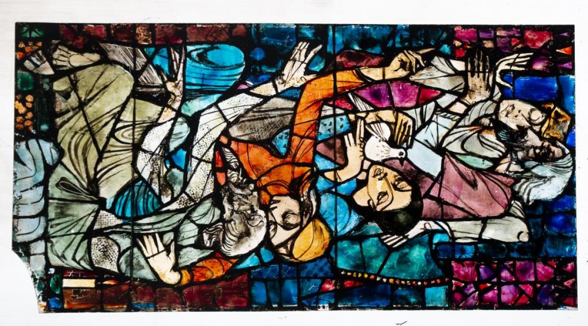 Brief description: A design for a stained glass light painted onto plastic. The design depicts the ages of man and features six figures, the third from the top is female and holds a bird in her hand. The female figure below her has her arm around an older male figure who is seated at the bottom of the light. The panel features a middle age and old age men. Made by Ervin Bossanyi in 1948.