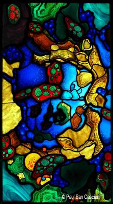 Brief description: Stained glass panel of the artistic interpretation of hydra tissue (a micro-organism) taken from an electron photomicrograph. Panel designed and made by Paul San Casciani in 1979.