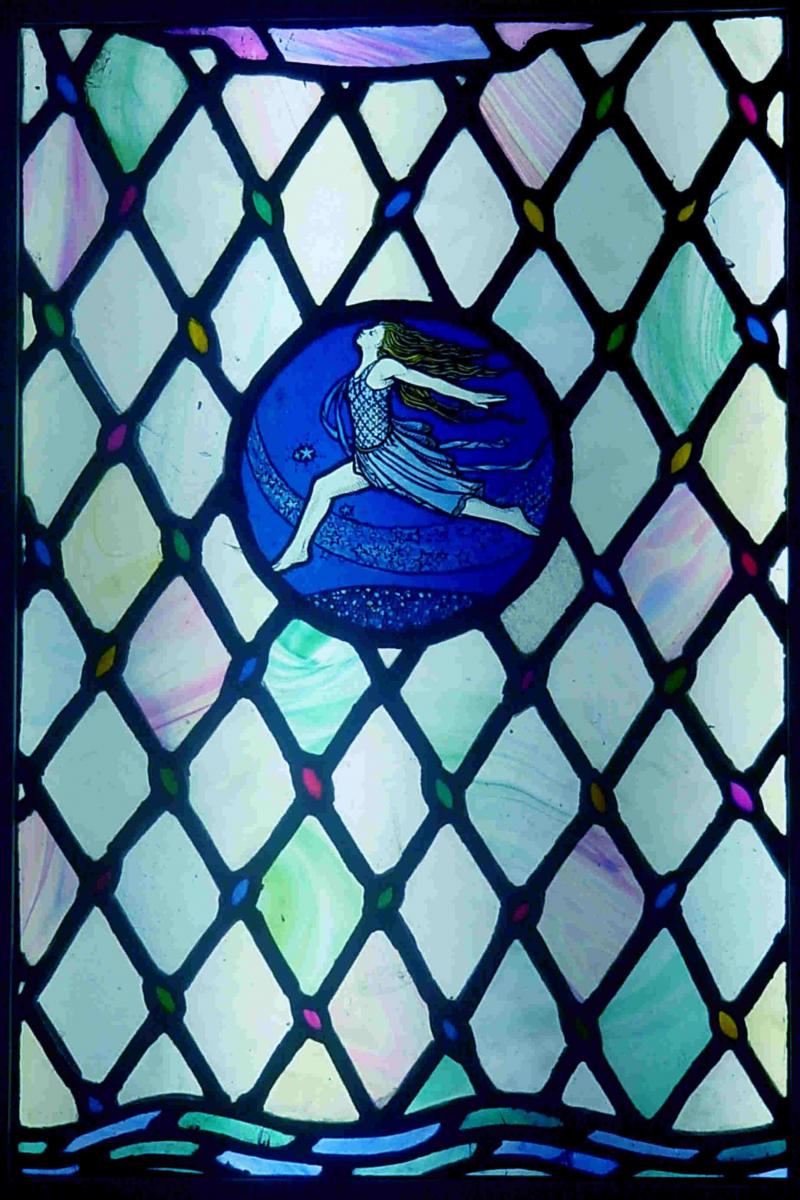 Girl Dancing is one of two panels on the theme made in the 1920s by Thomas Cowell (1870-1944) for the bathroom of his family home in Surbiton, Surrey. A central blue acid-etched roundel depicts a girl, facing left, with long flowing hair, dancing over a moonbeam. The roundel is set in diamond quarries with small coloured pieces set in interstices made using small off-cuts of slab glass. The artist celebrates the lively and sparkling qualities of the slab glass material. At the bottom of the window there is a suggestion of some waves, and at the top some coloured clouds. The dancer is said to be inspired by the American dancer, Isadora Duncan (1877/78-1927), who performed throughout Europe and USA to much acclaim and was known for her free and natural movements.