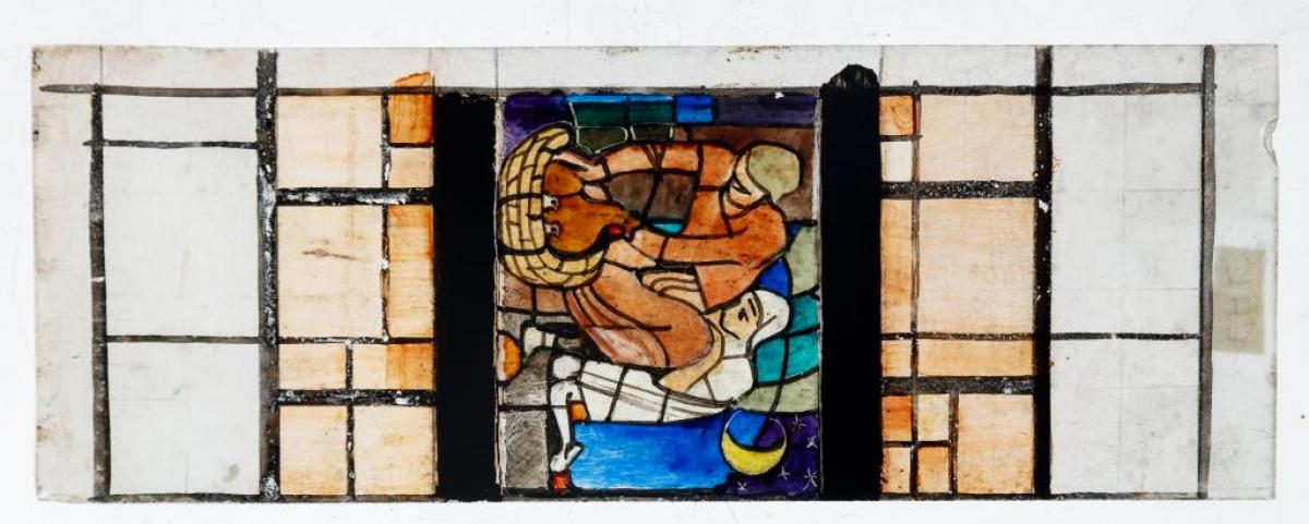 Brief description: A transparent design titled Evening showing two figures and a basket with a chicken in it. In the background is a dark blue sky, the moon and stars. This design is for a stained glass window by Ervin Bossanyi.