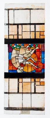 Brief description: A transparent design showing two figures holding their hands to a red orb, probably the sun. This design is for a stained glass window by Ervin Bossanyi.