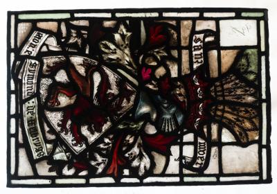 Stained glass armorial panel with a shield bearing a red lion. At the top of the panel there is a red crown and feathers at the top. Below the crown is a knights helmet. There are two scroll with inscriptions. This heraldic shield is thought to have been based on the medieval armorials of the Garter Stall Plates at St George's Chapel, Windsor. The arms appear to be those of Sir Simon Felbrigg, standard-bearer to Richard II, and later Knight of the Garter. However, the panel appears to have been wrongly orientated, as the lions should face the viewer's left. The exact heraldic counterpart to this shield can be seen in the chapel of the Chateau de Cormatin, near Macon, Burgandy. The panel was either made by Mabel Esplin,1874-1921, or Joan Fulleylove (1886-1947), both were influential women artists in the Arts and Crafts Movement and studied under influential twentieth-century stained glass artists such as Karl Parsons and Christopher Whall.