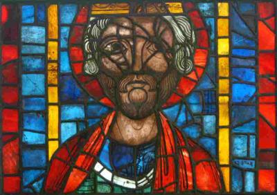 A stained glass panel of a bust of a monumental figure, wearing a crown, nimbus and jewelled robe, was probably a royal saint or Old Testament king. Predominantly rich red and blue. A medieval panel designed by a French artist. This monumental figure, wearing a crown and jewelled robe, was probably a royal saint or Old Testament king. The panel almost certainly comes from the side windows in the clerestory of the choir of Soissons Cathedral, which originally also contained enthroned figures of prophets and apostles in two tiers. The east window, showing the Tree of Jesse, Christ's family tree, was given by King Philip Augustus himself. Begun in the late 12th century and brought into use by 1212, the choir at Soissons was a key building in the evolution of the High Gothic architectural style and one of the very first cathedrals to include the giant figural stained-glass windows so characteristic of these great churches. Many of the windows were removed in the 19th century and then found their way into museum collections.