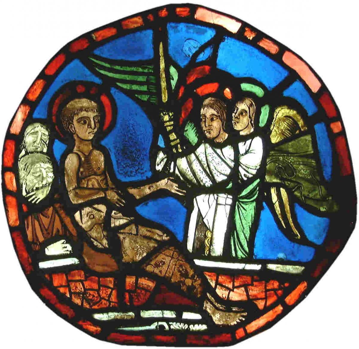 Brief description: Stained glass roundel depicting St Vincent being consoled by angels. The panel was made between about 1225-1250 by a French artist.