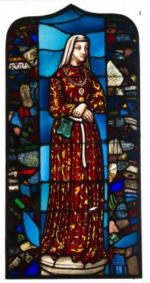 Brief description: Stained glass lancet depicting a woman in a late medieval dress. The main figure was made in the 19th Century but set in medieval fragments.