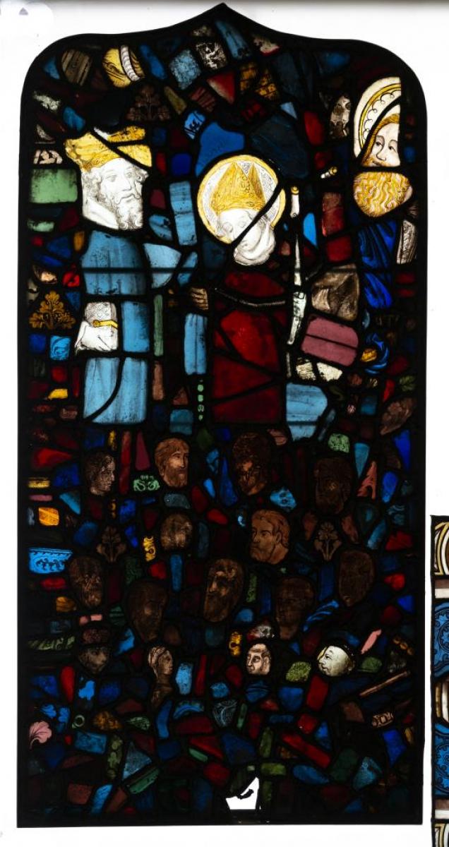 Brief description: Stained glass lancet depicting a king, a mitre saint and a third large head. Below is a crowd of heads. This panel has a mixture of 19th century glass, 15th century glass and early-13th century glass.