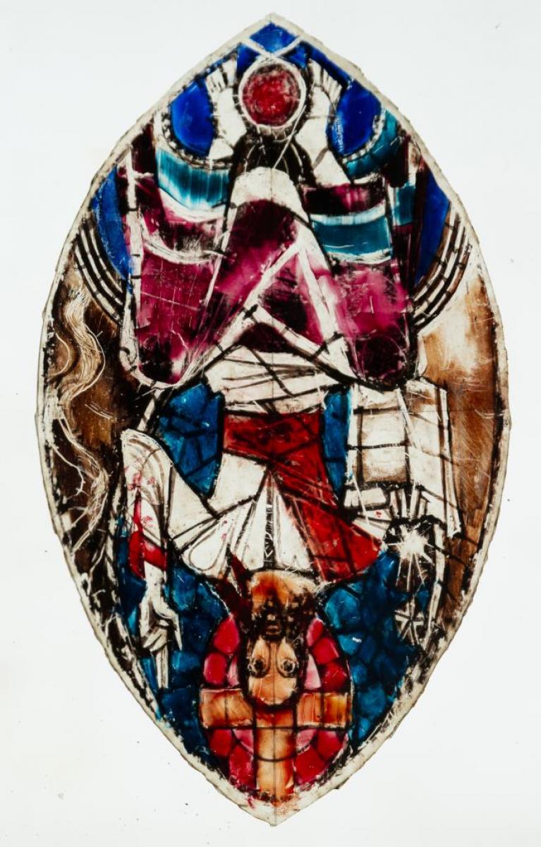 Brief description: Maquette for a mandorla stained glass window designed by Ervin Bossanyi in the late 1940s depicting Christ in Majesty with book in left hand and right hand raised in a gesture of blessing