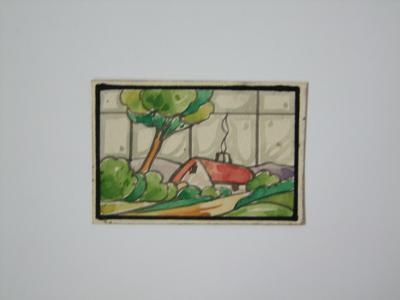 Brief description: Panel design: Single panel: landscape, cottage, against rectangular quarry tiled background