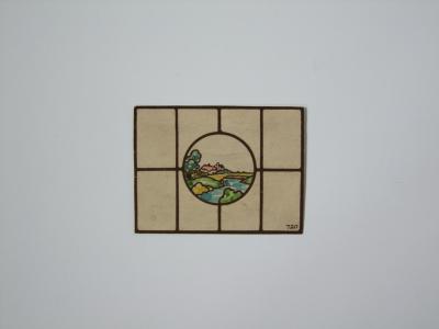 Brief description: Panel design: Single roundel: riverscape, cottage in rectangular panel, against rectangular quarry tiled background