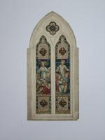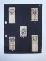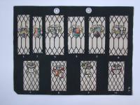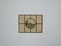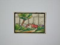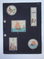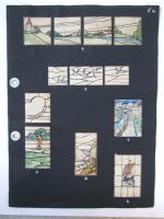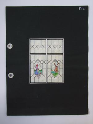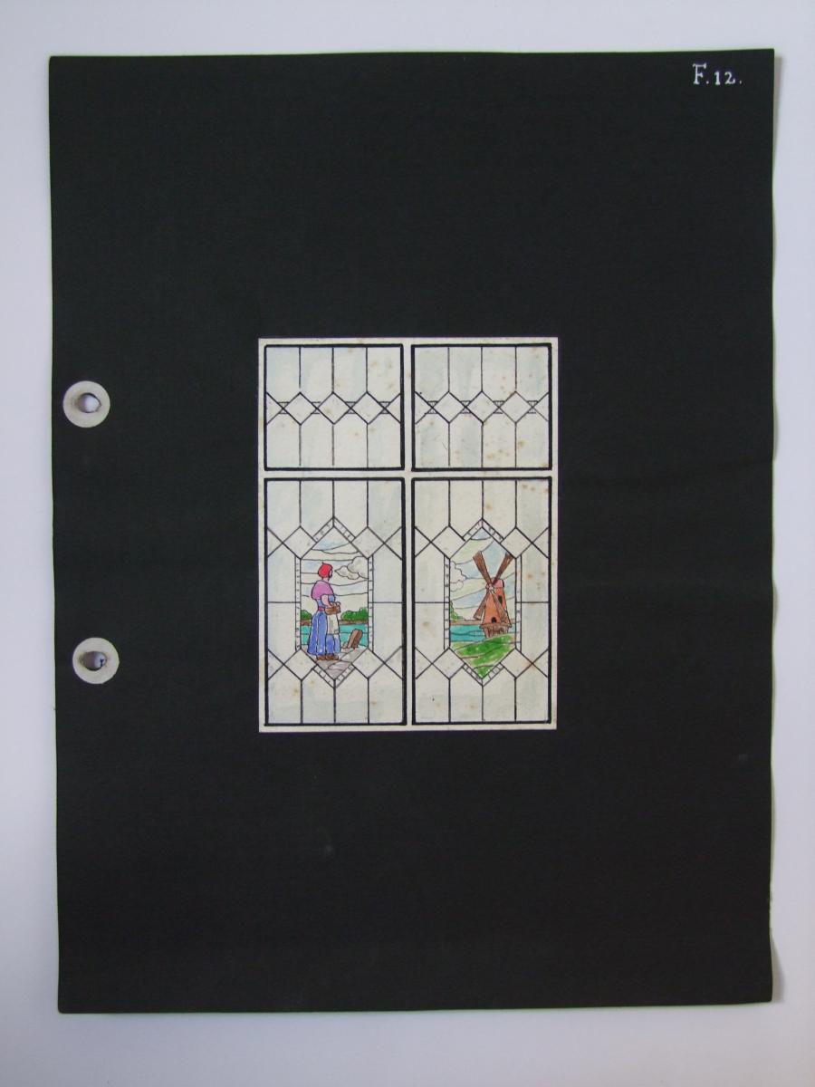 Brief description: Single window design in four panels, larger two at bottom, (1) Woman with basket, Dutch style. (2) River scene with windmill. Design 92x123mm. Mounted on black portfolio page.