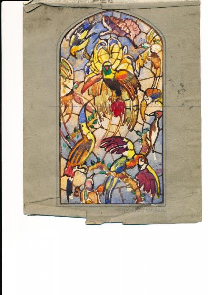 Brief description: Coloured design by Leonard Walker depicting exotic birds