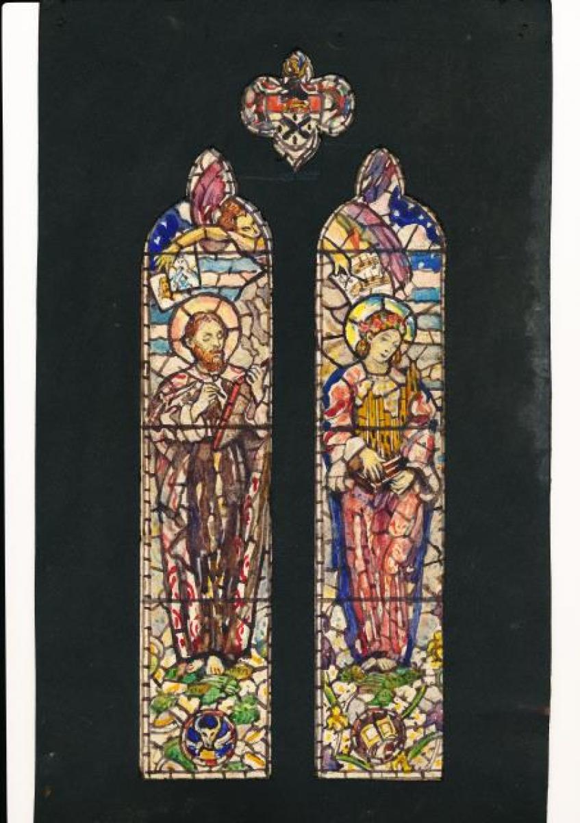 Inscription: ink note back of design (central) This design to be returned to Leonard Walker R.I. 151A King Henrys Road London N.W.3. Inscription not visible on cartoon but taken from photograph (ELYGM:2012.1.18) TO COMMEMORATE THE LIFE AND BENEFACTIONS OF THE BELOVED MASTER ELECT/ OF THE WORSHIPFUL COMPANY OF GLAZIERS / SIGISMUND CHRISTIAN HUBERT GOETZE / WHO FELL ASLEEP ON HIS 73RD BIRTH/ DAY OCTOBER 24TH 1939.