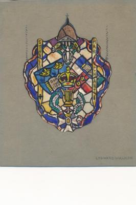 Design for a crest/emblem themed window or possibly an upper light, signed Leonard Walker. The design shows a lyre enclosed by laurel leaves (intertwined with text), a Royal crown above and a cornucopia of other images. The emblem suggests the window may have been commissioned by Sir Stanley Marchant for The Royal Acadamy of Music. Leonard Walker designed and executed decorative windows for the Royal Academy of Music at the suggestion of the Principal Sir Stanley Marchant in 1944 which remain in situ. The central window shows a Figure of Victory arising with the morning sun of a new era. Having sounded a victorious note on her trumpet, she greets the Dove of Peace. Crowning the side windows are two damsels contributing their music to the chorus of thankfulness. The left side window show the Royal Arms whilst the right side window shows the crest of the Royal Academy of Music, with lyre. The use of the lyre enclosed with laurel leaves and an inscription for the Royal School of Church music may indicate that this design was a concept for part of the final window or else an additional window was constructed elsewhere for Sir Stanley Marchant.