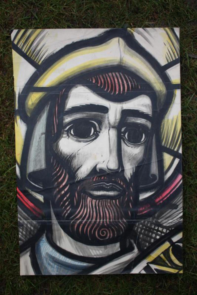 An ink and wash cartoon by Francis Spear for the face of St. Luke for the four evangelists' (with royal heraldry underneath) east window. The Great East Window was dedicated in September 1951 by Rev Dr Nevile Davidson, the minister. It was paid for by Lord Bilsland, Sir Robert Sinclair, Charles Spencer and Anne Rintoul Spencer. Spear recalled an episode concerning the Secretary of the Friends who remarked at the dedication service that 'when the sun shone on the windows, St Luke winked; I told him I did not charge extra for miracles but I would gladly paint another eye if he climbed the 50 feet or so to replace it.' The winking eye was caused by the dark colour accentuating the light. At some point the image has been cropped from a larger cartoon.
