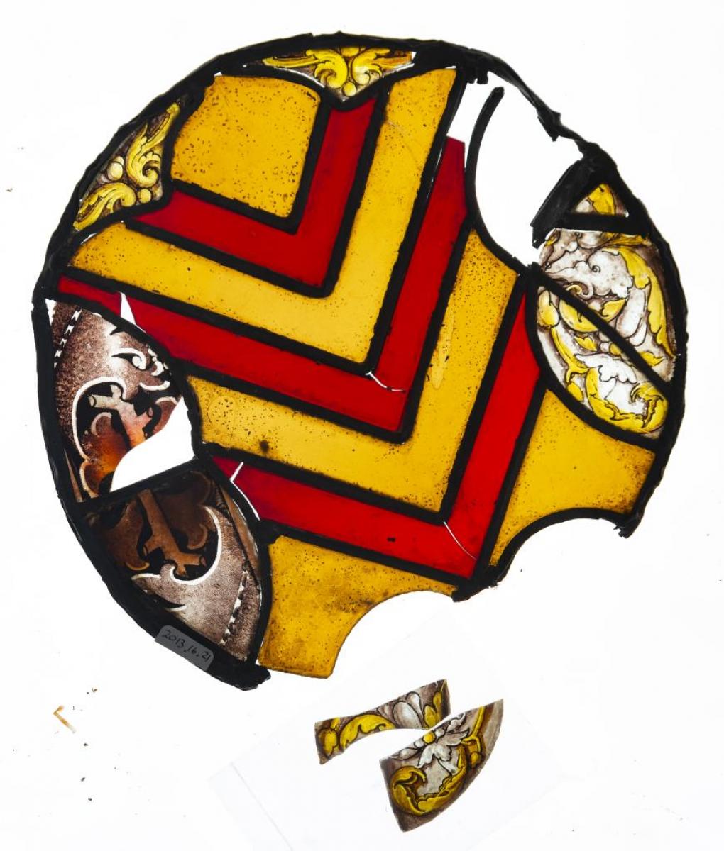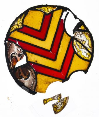 Brief description: A heraldic panel bearing the De Clare coat of arms. Or, three chevrons gules.