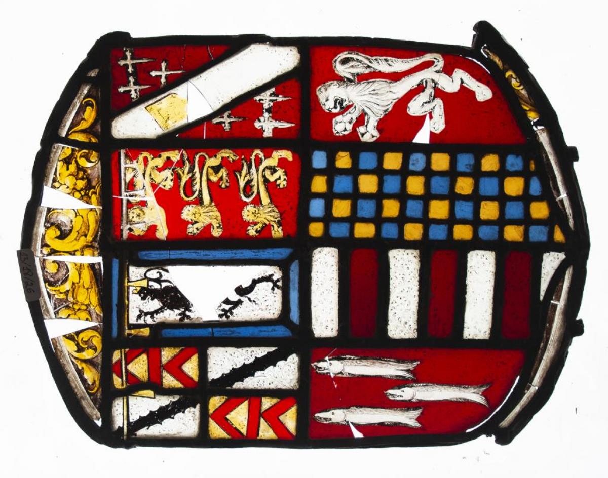 A complex shield depicting divided into eight (top left to right) 1. six argent crosses with an argent searpe on a field of gules, 2. three or lions on a field of gules (England), 3. one argent rampant lion on a field of gules, 4. one chequered or and azure section, 5. one sable rampant lion on a field of argent with a azure border, 6. one section divided into four with two sable searpes on fields of argent and two chevrons and one closet (both gules) on fields of or, 7. one with three gules bars and three and a bit argent bars and 8. three argent fish on a field of gules. There is a bottom border of white glass with silver stain and paint on the left hand side (possibly originally part of a thicker boarder).