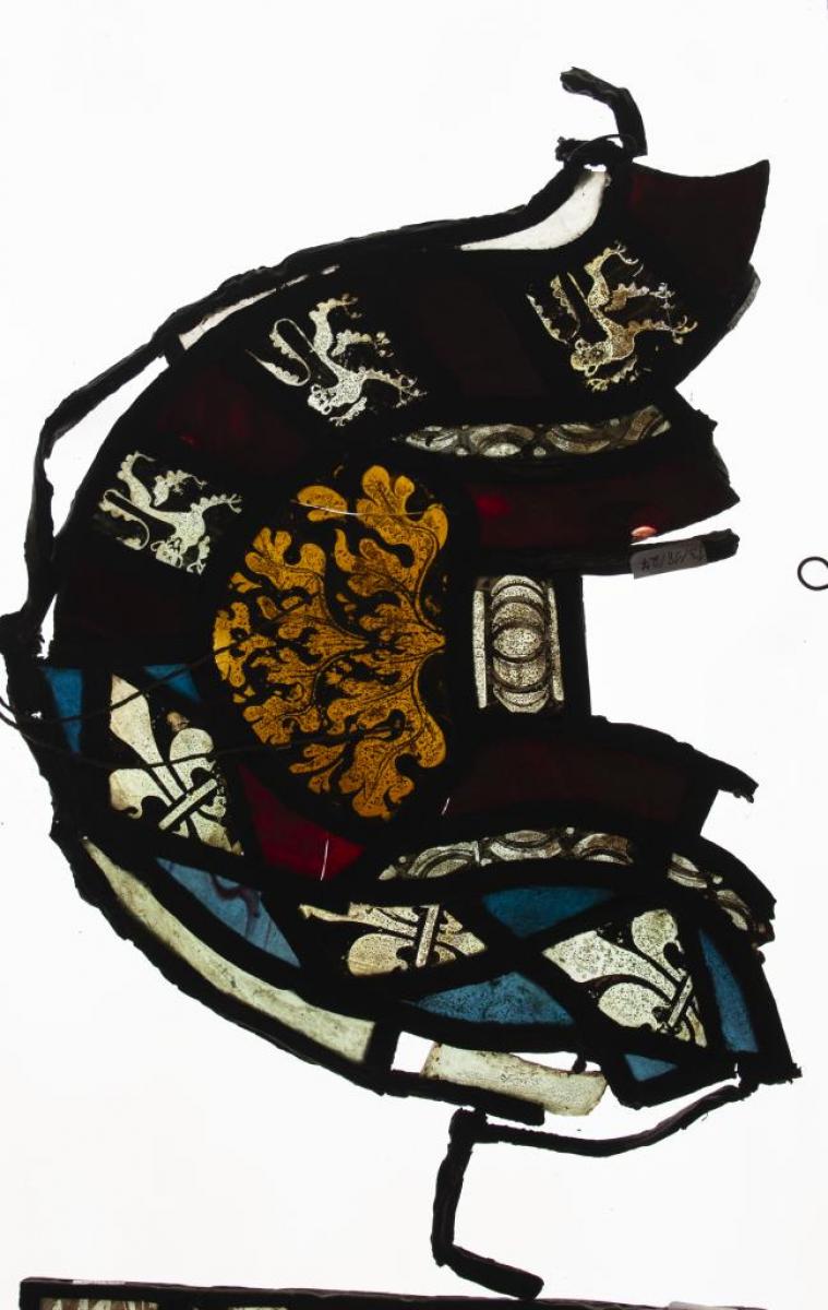 Brief description: A panel depicting lions and fleur-de-lys, with a flame shaped foliage motif in the centre.