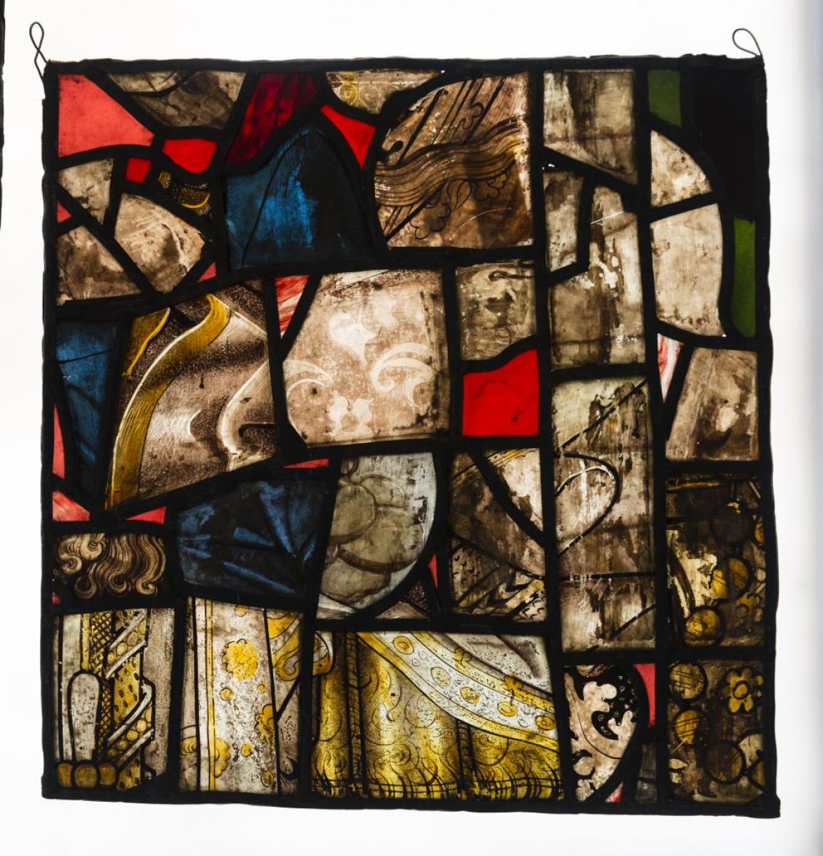Brief description: A composite panel containing an assortment of medieval fragments with green and red flashed glass infills.