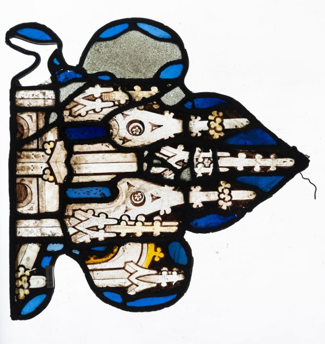 Brief description: A composite panel containing an assortment of medieval fragments with an architectural design. The panel contains Medieval fragments which have been releaded after the original panel had been damaged with seven matt painted replacement fragments and small blue in-fills.