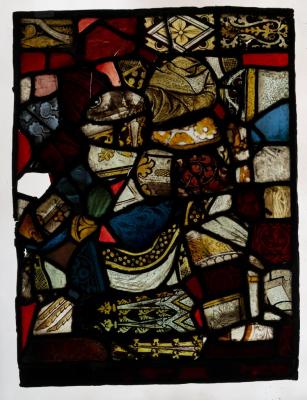Brief description: A composite panel containing an assortment of medieval fragments including a cloth design, architectural designs, a feathered design, Rinceau and foliage designs. Border designs include one foliage and one decorative diamond fragment. The panel contains Medieval fragments which have been releaded after the original panels had been damaged with small red and white in-fills.