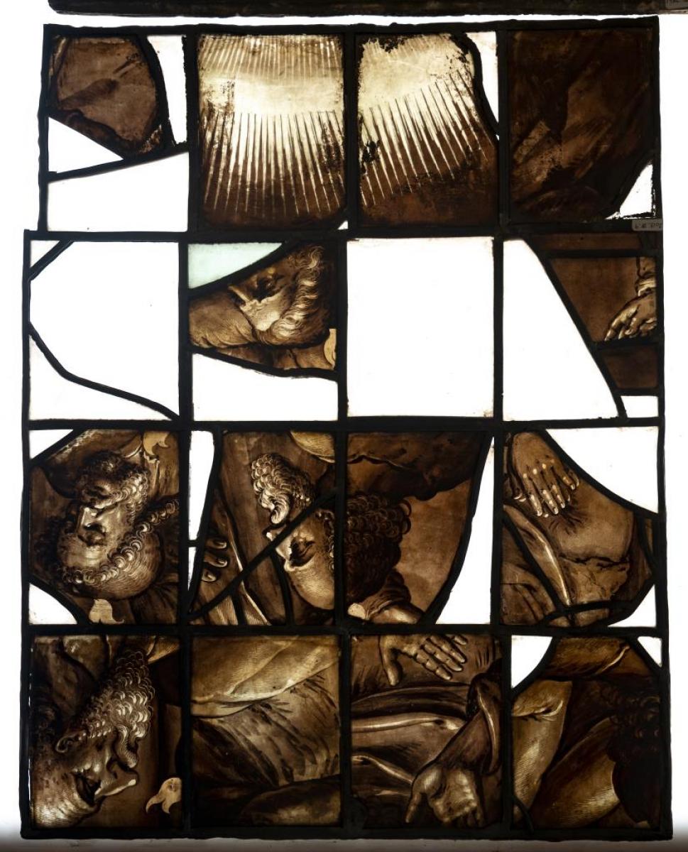 Brief description: A composite panel containing an assortment of 18th century painted fragments (though not completely in the right order) The panel contains 18th century painted fragments which have been releaded after the original panel(s) had been damaged with moderate sized white glass in-fills.