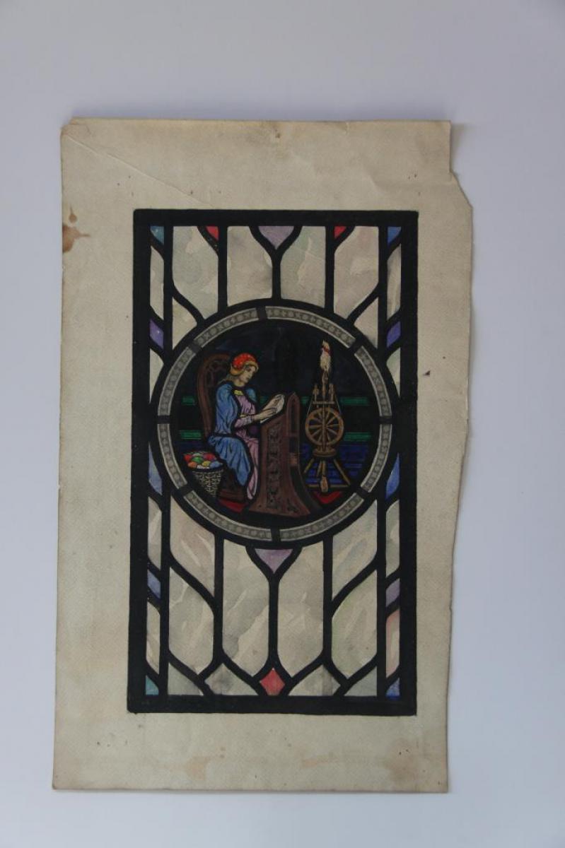Brief description: Pen and ink design for a rectangular stained glass window depicting the Virgin at a reading desk in a roundel, set against a plain leaded glazing pattern by Leonard Potter.