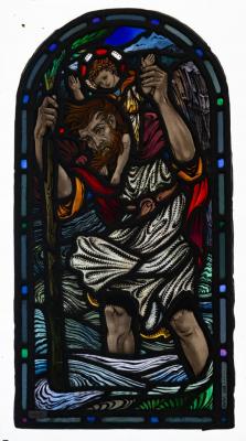 Brief description: Stained glass panel of St Christopher by Leonard Potter (1928)