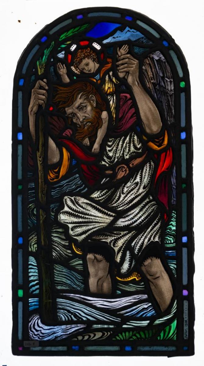 A stained glass panel depicting St Christopher by Leonard Potter (1928). Depicting the legend of St Christopher who carried a child, later revealed as Christ, across a river, this panel uses brightly coloured glass and paint to show the texture of his linen tunic and leather belt. The artist Leonard Potter (1936-2011), the artist, studied at the Central School of Arts and Crafts, where he was a pupil, assistant, and colleague of Karl Parsons. Potter worked closely with Parsons, as well as other key artists such as Christopher Whall and Harry Clarke. However, he gave up his stained glass career in the 1930s to take up a position within the BBC's publicity department, where he was involved in designing TV logos, screen tests and backdrops.