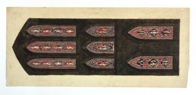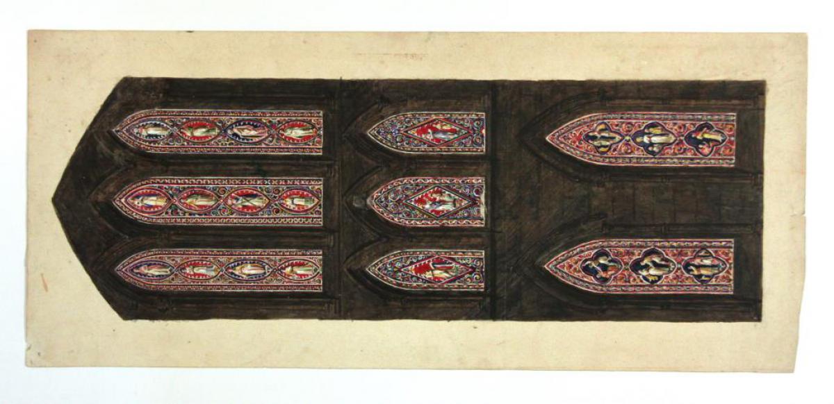 Brief description: Coloured sketch design for windows containing three rows of medallions with quatrefoil scenes. The middle row depicts scenes of the Annunciation and the top row depicts various saints.