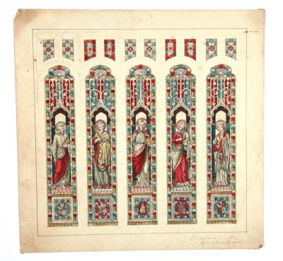 Brief description: Coloured sketch design for a five-light perpendicular window depicting figures of four Apostles with Christ in the centre.