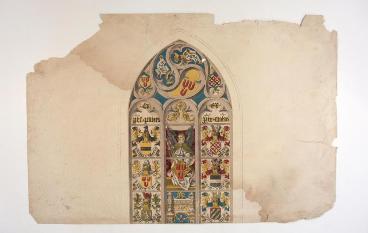 Brief description: Colour print of a German window, perhaps 16th century in date, with heraldic shields and mottos in German. Previously belonging to stained glass artist George Caleb Hedgeland.