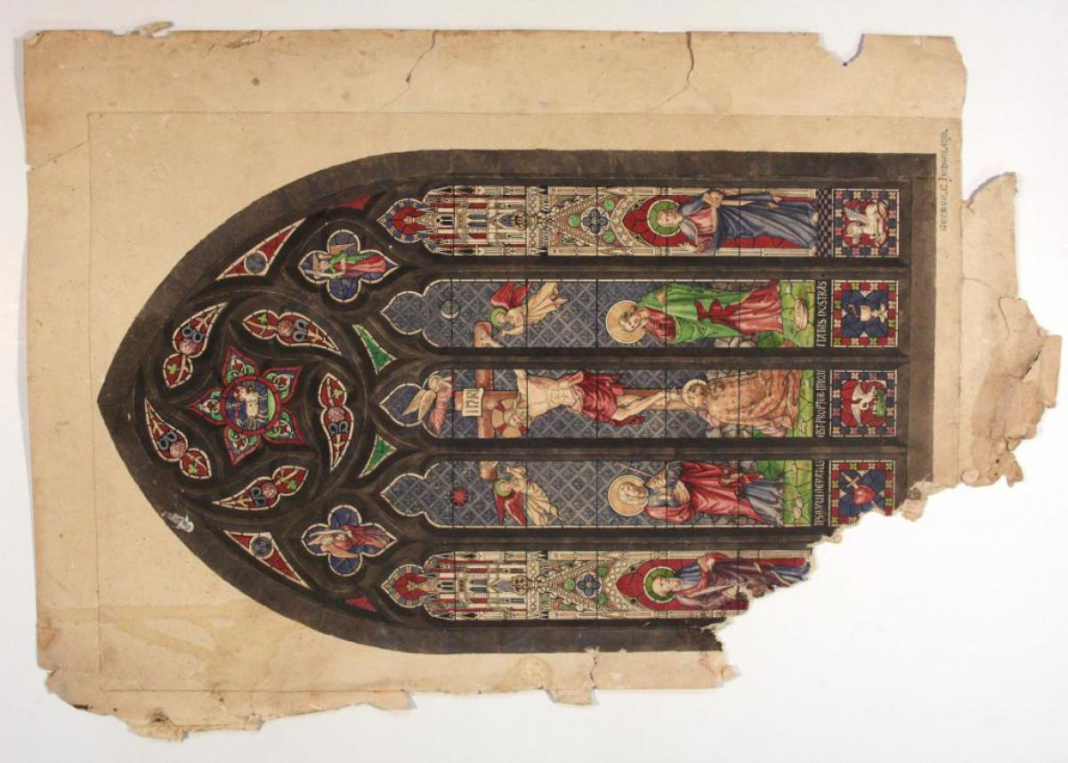Brief description: Coloured pen and ink design for five-light window depicting Christ on the cross, with Mary and John on either side. Mary Magdalene is shown at Christ's feet. The sun and the moon appear behind the cross. The outer lights depict two gospel writers, probably Matthew and Luke. In the tracery lights are angels bearing scrolls and an Agnus Dei.