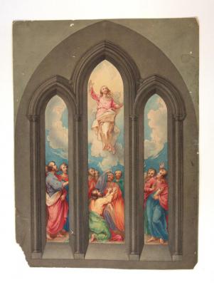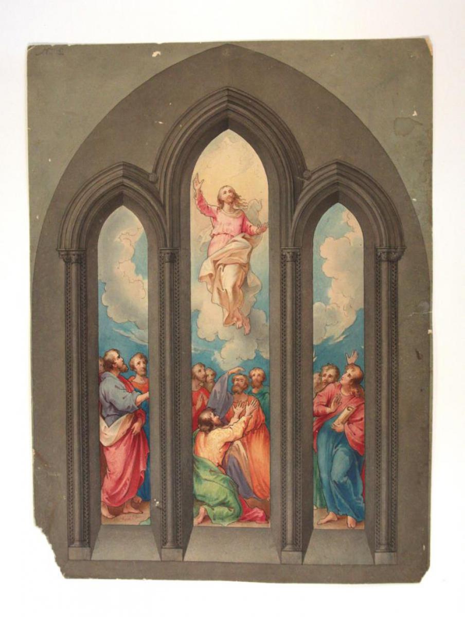 Brief description: Coloured sketch design for a three-light window depicting Christ's Ascension