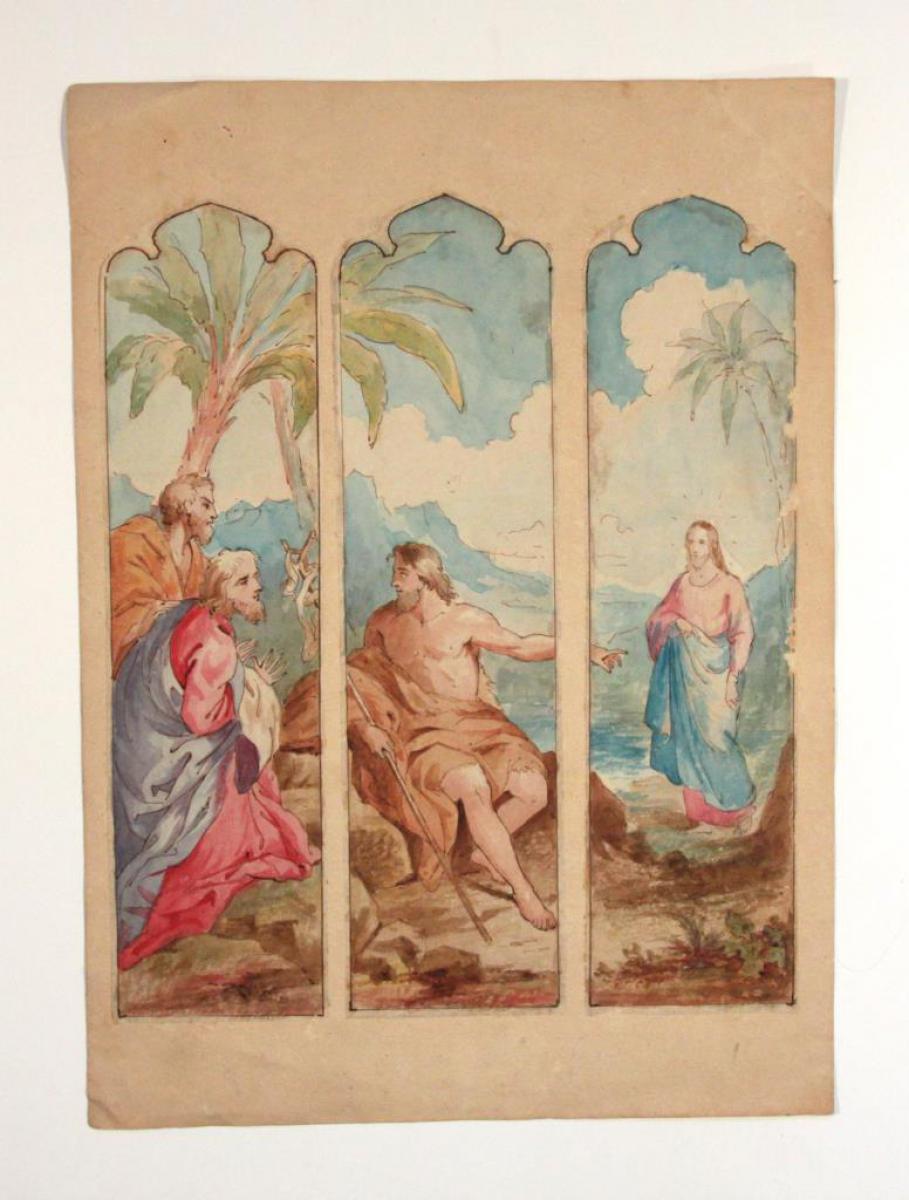 Brief description: Coloured sketch design for a three-light window depicting John the Baptist pointing to Christ