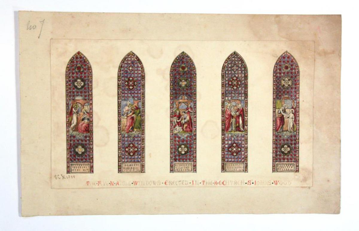 Brief description: Coloured design for five pointed lancet windows, as designed and installed for the Roman Catholic Church of St John's Wood. The lancets depict scenes from the life of the Virgin Mary, including 1. The Annunciation, 2. Mary and Elizabeth, 3. The Nativity, 4. The Presentation in the Temple, and 5. Mary the Mother of Christ