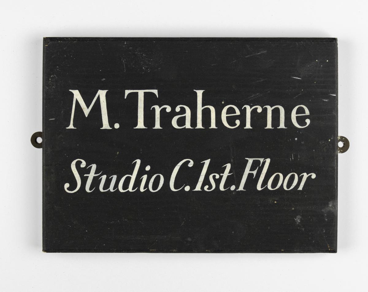 Brief description: Wooden sign with painted inscription ‘M. Traherne Studio C. 1st Floor.’
