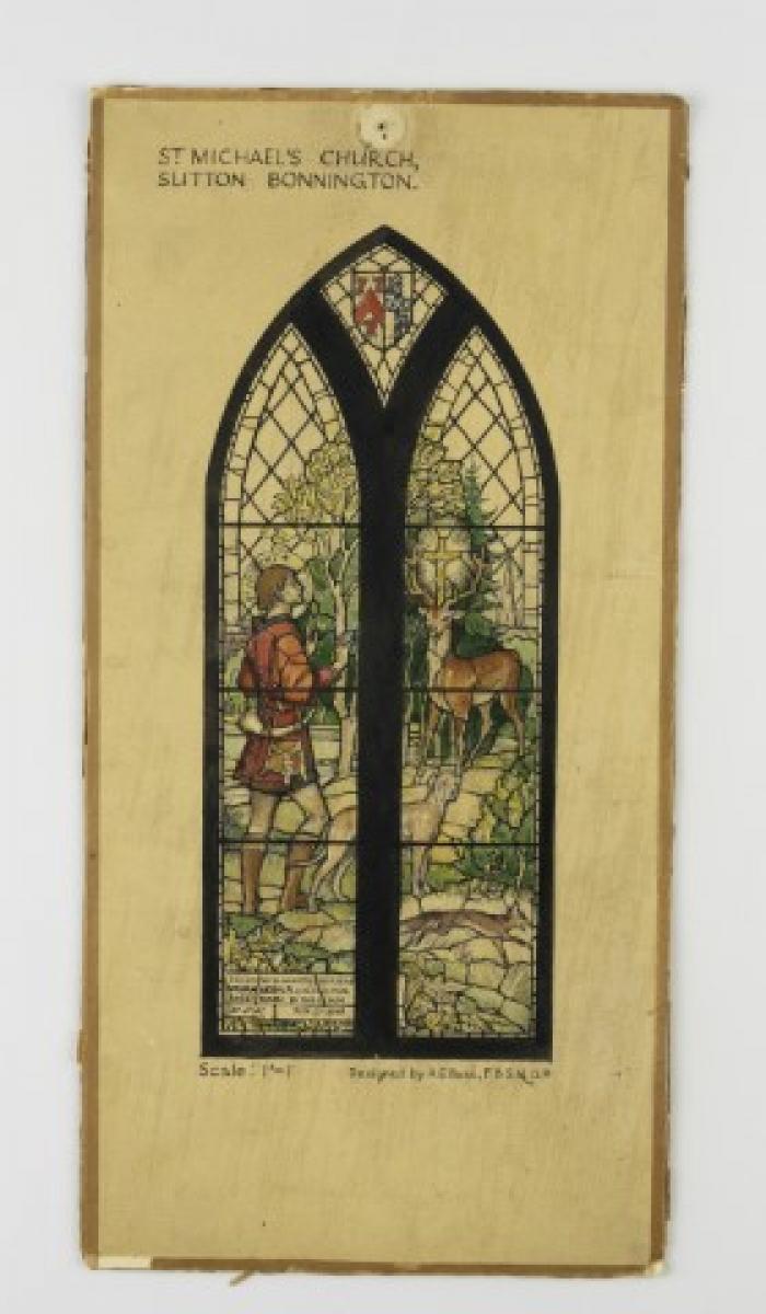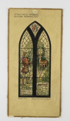 Brief description: Design for a stained glass window made up of one light depicting St Hubert and a hunting scene. Designed by A E Buss at Goddard and Gibbs studio, London