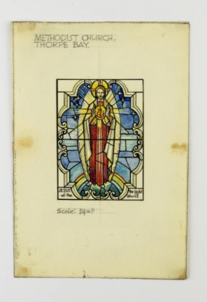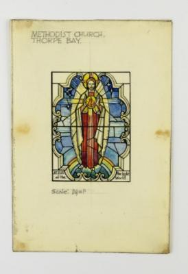 Brief description: Design for a stained glass window made up of one light depicting Christ, light of the world. Designed at the Goddard and Gibbs studio, London
